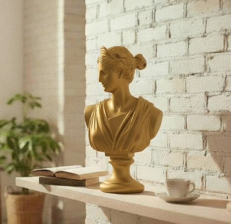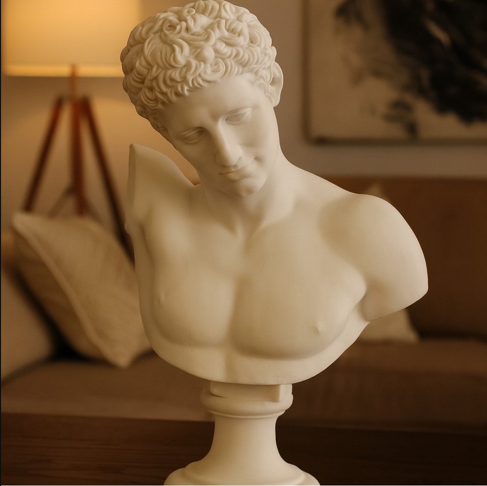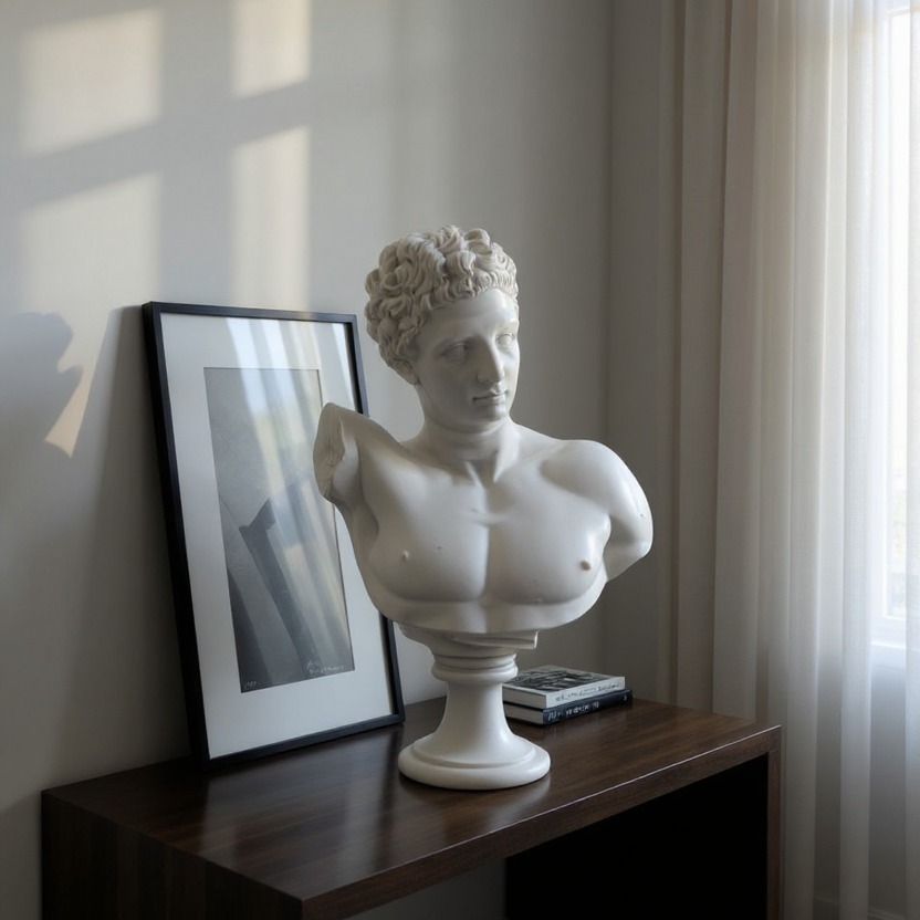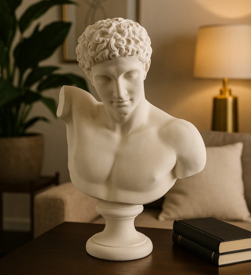 Beyaz Hermes büstünü, antrasit bir duvarın önünde veya koyu renkli ahşap bir dresuar üzerinde sergileyerek yüksek kontrastlı, lüks bir görünüm elde edebilirsiniz.